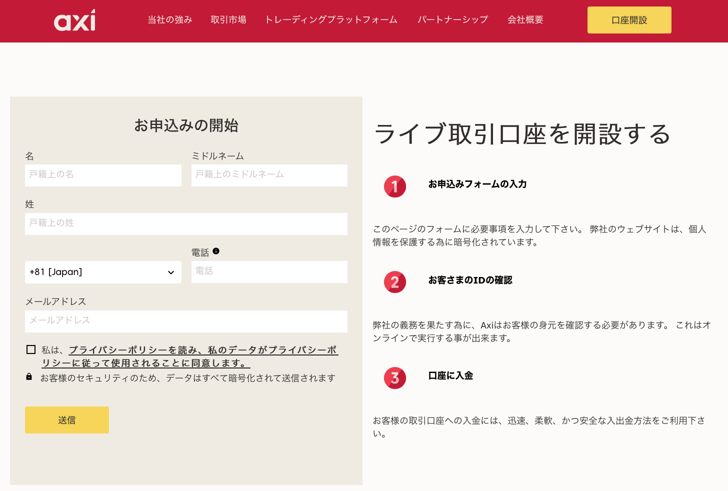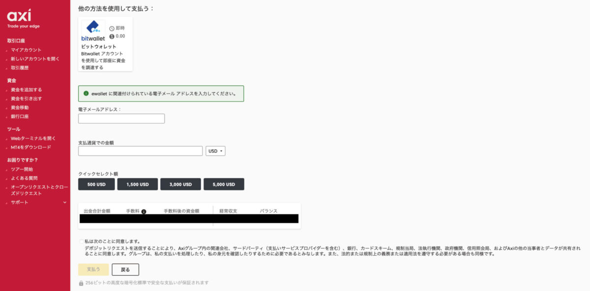 Axiのクライアントポータルの左側にある「資金を追加する」をクリックして下さい。すると、上記の画面が現れます。