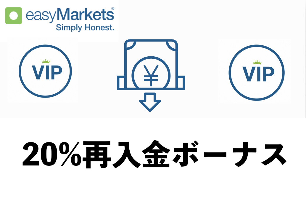 easyMarketsでは、VIP口座を利用して、かつ、50,000円以上の再入金を行った日本人トレーダーに20%の再入金ボーナスを進呈します。