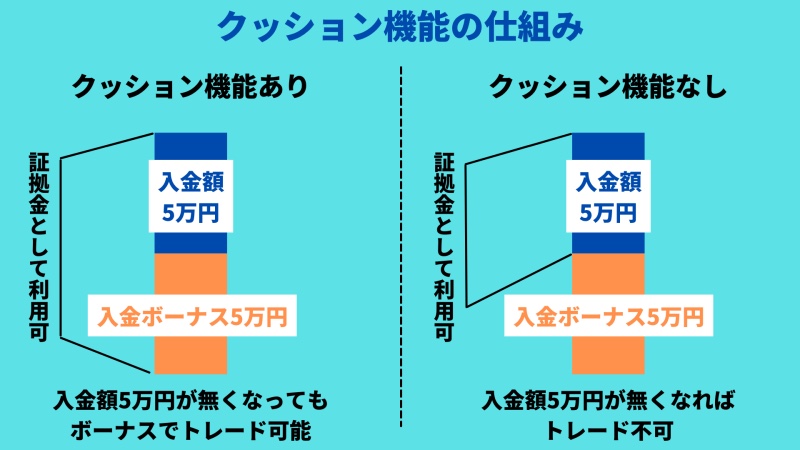 クッション機能があるので、含み損が入金した残高より多くなっても、その損失をボーナスが証拠金として負担するので、強制ロスカットを回避できます。