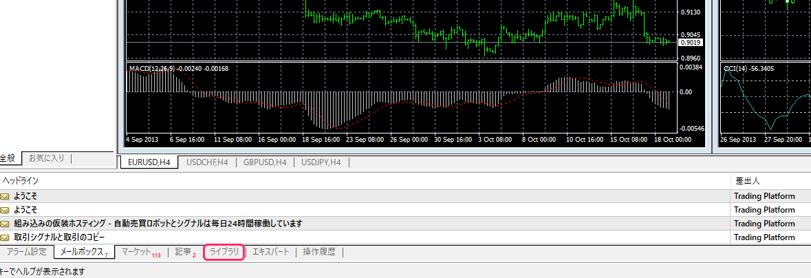 MT5プラットフォームの下部「ライブラリ」から、MT5の開発元であるMeta Quates社の公式サイト「MQL5」で陳列されている自動売買ソフトを無料で利用することができます。