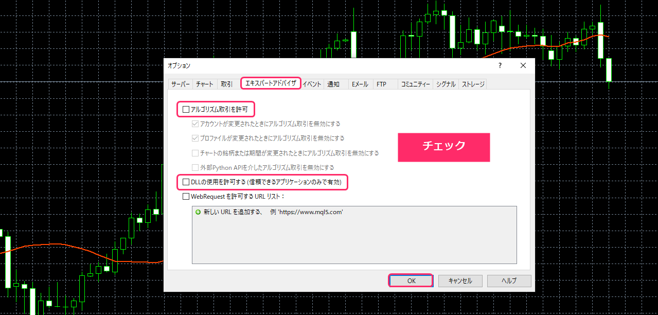 ④ 「自動売買を許可する」・「DLLの使用を許可する」の項目をクリック