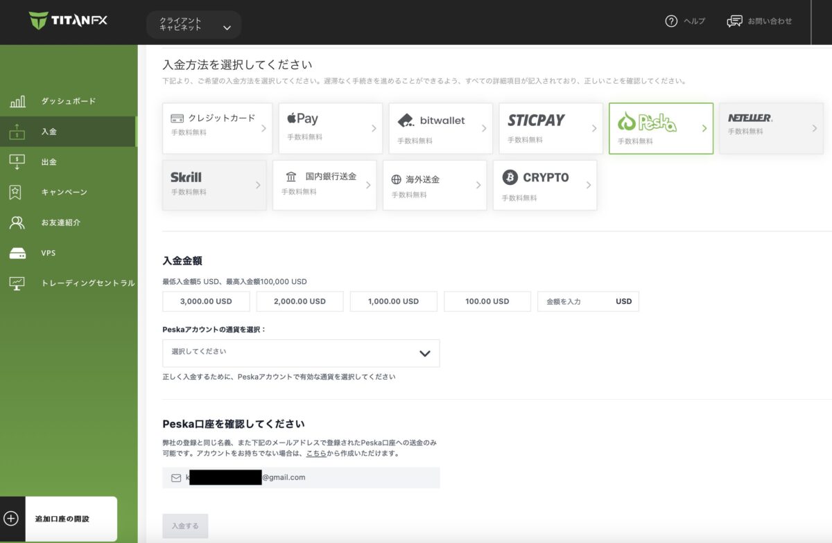 なお、TitanFXに登録したときと同じ名義、同じメールアドレスで登録されたPeska口座からのみ送金可能です。
