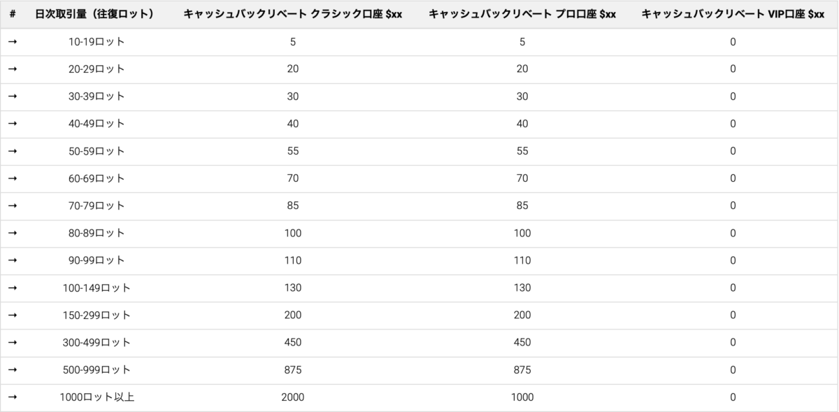 1日あたり往復10ロット以上の取引をする人は、以下の表に記載されているように、最大約20万円までのキャッシュバック報酬の対象となります。