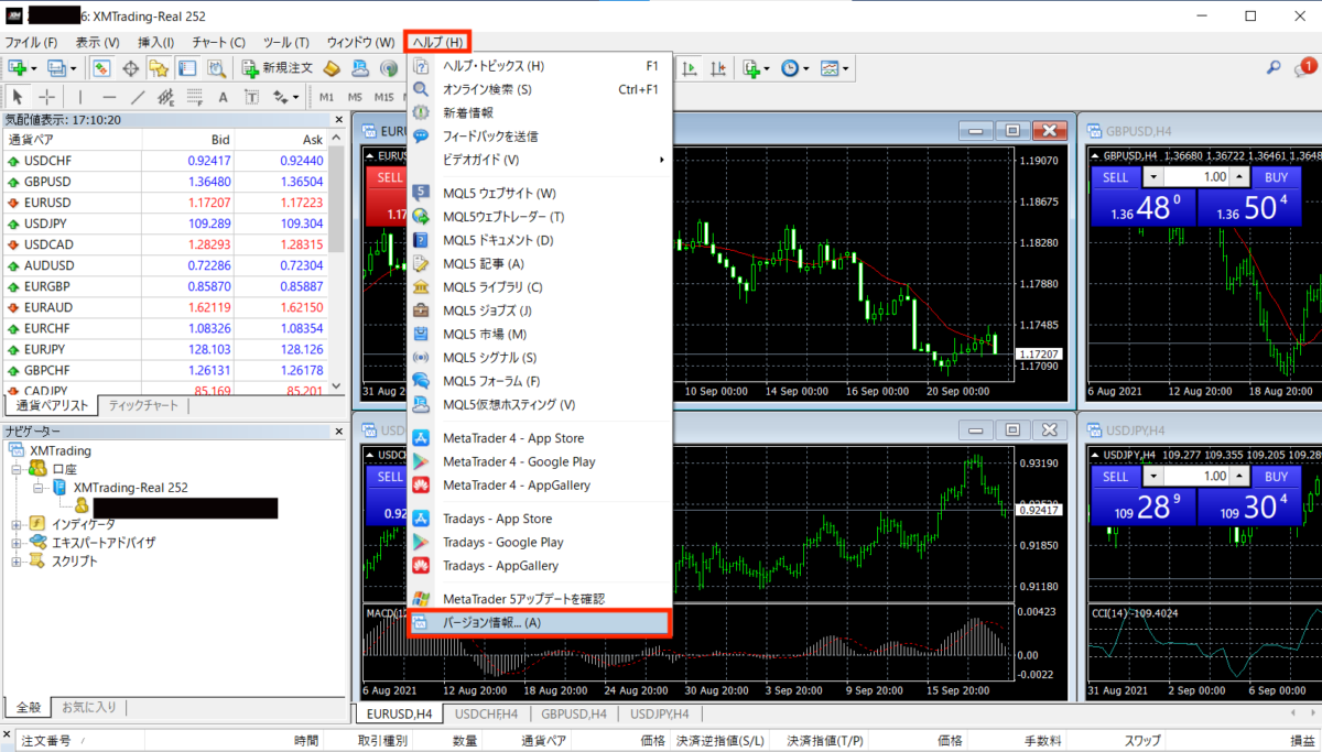 MT4・MT5チャート画面上部の「ヘルプ」→「バージョン情報」よりご確認いただけます。