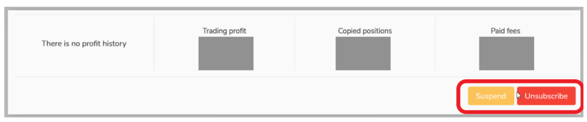 コピートレードを止める方法は、SuspendもしくはUnsubscribeのどちらかのボタンをクリックするだけでいつでも一時停止または登録解除できます。