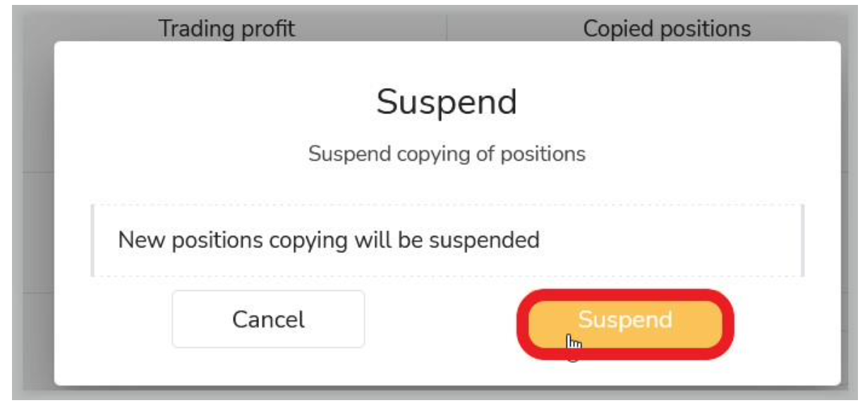たとえば、フォロワーが撤退したり、数日間取引を一時停止したい場合は、「Suspend」をクリックするだけです。