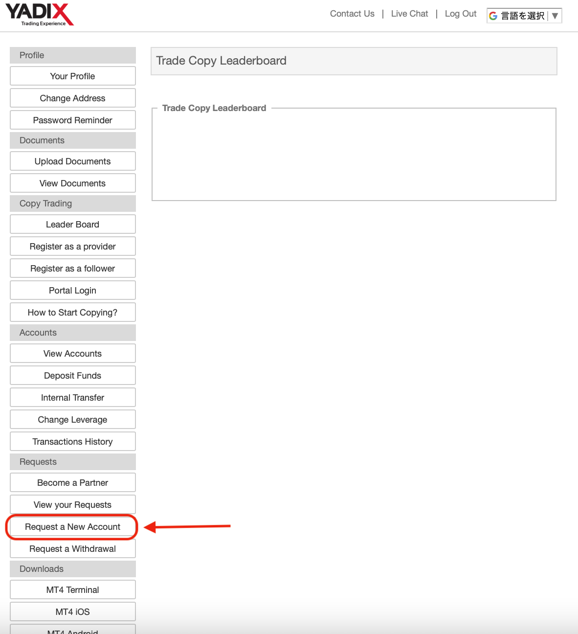 もし、Scalper ECN アカウントをまだ開設していない人は、左メニューの 「Requests」の下にある 「Request a New Account」 をクリックして作成できます。