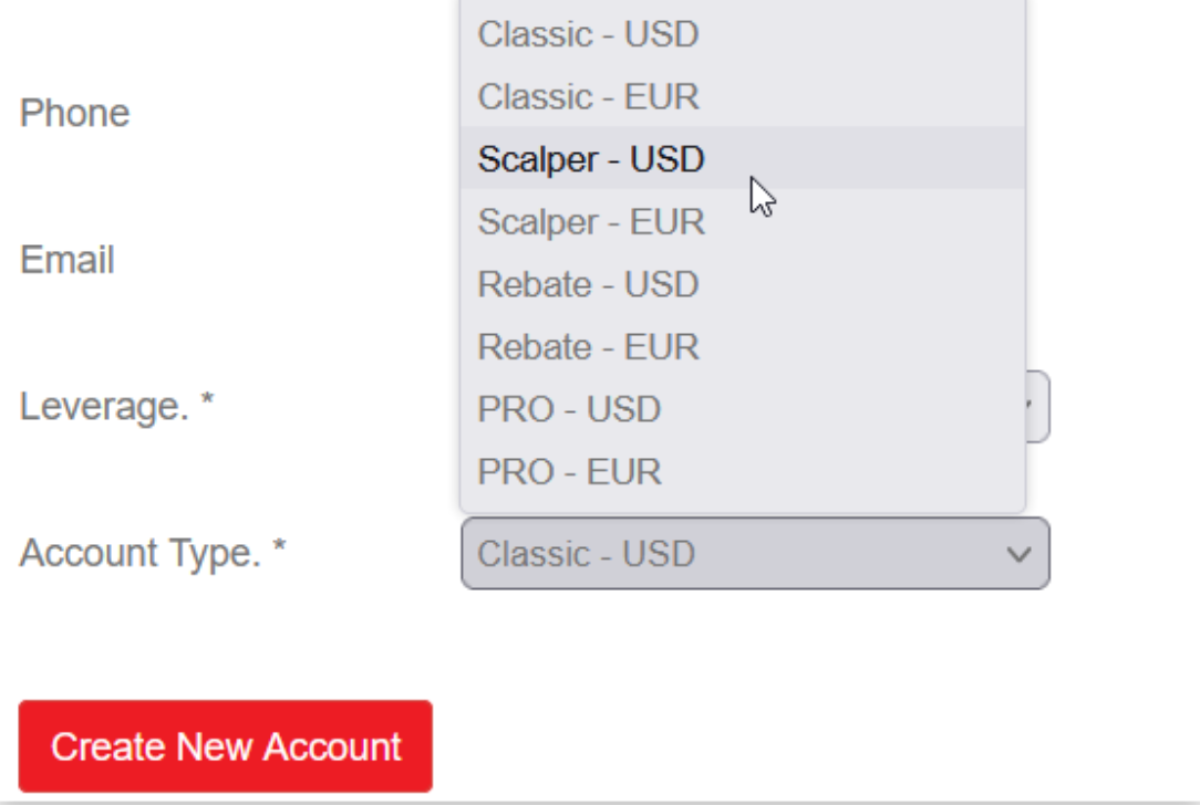 レバレッジと、取引したい通貨のScalperアカウントタイプを選択します。